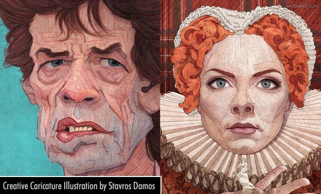 Stavros Damos is an illustrator and artist from Thessaloniki. He was born in 1977, Thessaloniki, Greece. He graduated with a degree in graphic design from AAS College of Art and Design. He specializes in caricature illustrations, advertising illustrations, portrait illustrations and more. His caricature illustrations are quite unique, because you can see the lines of many sorts used to create the illustrations. The idea of using lines and no shading, makes these series of caricature illustrations very unique.