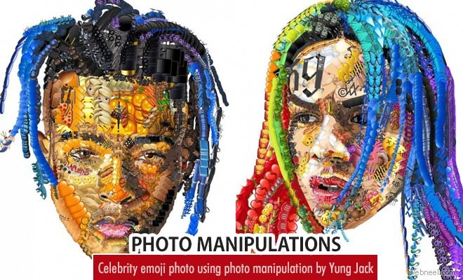Who doesnt love emoji's, they just seem to be the language of the mobiles? Nobody ever talks anymore with sentences, they just use emoji's. Yung Jack is a graphic designer and visual artist, who is extremely talented in creating photo mash-ups of celebrities using emojis. Every bit of detail is captured beautifully through different kinds of emojis. The tattoos, hair color, braids, teeth are so uniquely created through photo manipulation. Yung Jack uses Adobe Photoshop for his creative works. Yung Jake is an american(Los Angeles) artist born in 1990. He is also an excellent rapper.