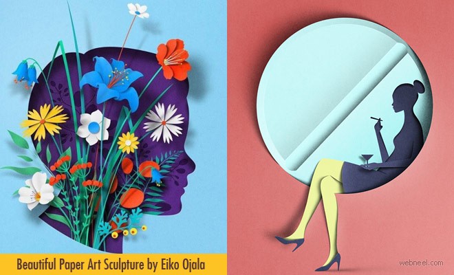Eiko Ojala is a specialist in paper art sculpture. He is a well known graphic designer and illustrator in the art industry. According to his biography," He works mostly digitally and draws everything by hand. Within his work process Eiko likes to study the forms of shapes and to work closely with light and shadow". He likes to add a healthy sense of humor to his paper sculptures.