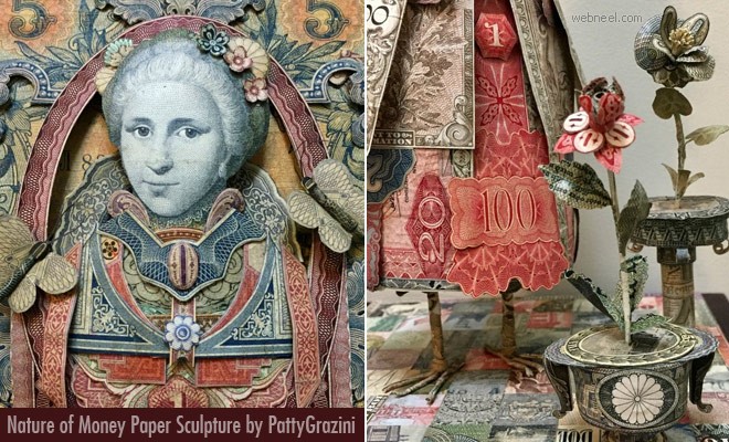 Paper sculpture and artworks : Patty Gazini is a talented artist/sculptor(paper art) from Seattle. She has exhibited many series of paper sculptures using different kinds of materials. Her latest paper sculpture was using money from different parts of country. The paper money is in different colors and they were either borrowed or gifted for her paper sculptures. Her money paper art is quite popular among her collectors and in the social media circles. Patty Gazini's paper artwork is on exhibition till June 2nd 2019 at Bainbridge Island Museum of Art, Seattle.