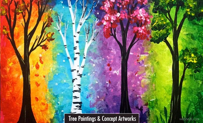 We have put together some beautiful tree paintings from top artists around the world. Artists who enjoy the nature usually try tree paintings with different themes and techniques. Trees come in various shapes, colors and textures, so it's a real challenge for artists who are willing to advance their level. Realistic tree paintings and paintings of trees make great interior decoration pieces, since its a constant reminder of the nature. Colorful painting ideas of trees, animals, birds can brighten up even the darkest of rooms.