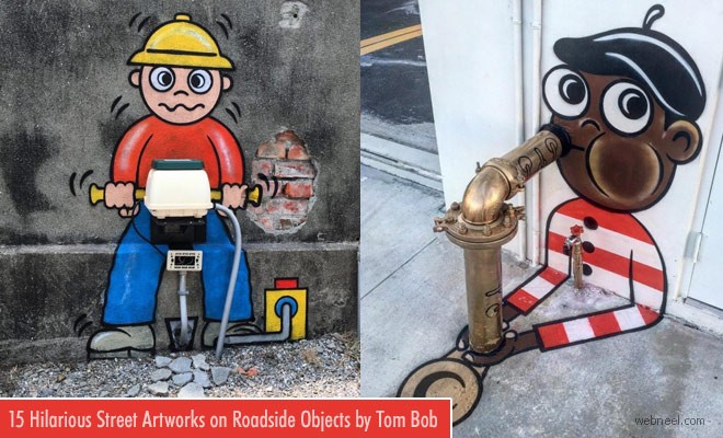 Creative Street Art ideas: Tom Bob is an American Street artist who enjoys vandalizing objects with a splash of his color on the american roads. He turns boring pipes, pit hole lids, into interesting street art which is thoroughly enjoyable. His sewer frying pan with eggs, beetles playing drum, a boy playing saxophone on a roadside pipe are some of the street art works we thoroughly enjoyed. We find Tom's street art interacting with it's surrounding in a cute and fun way.